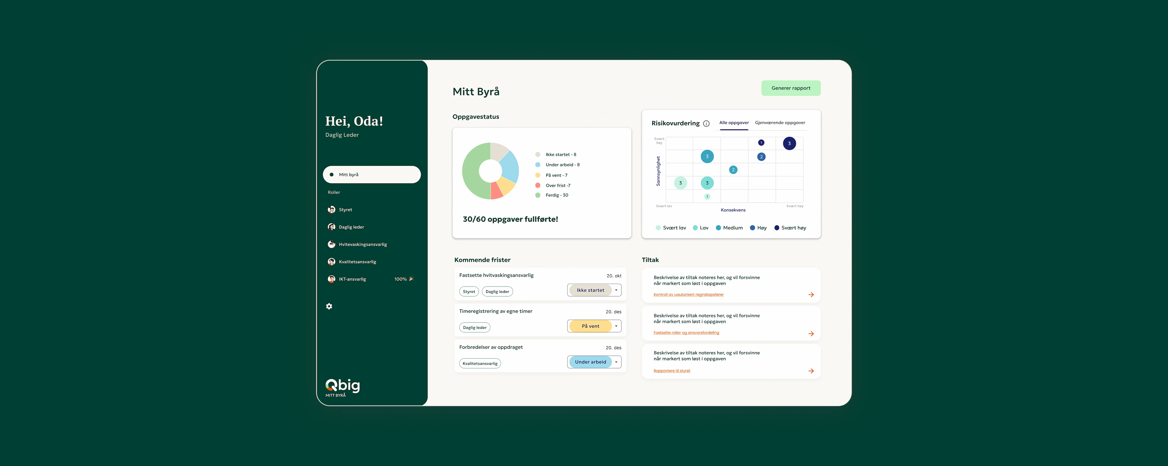 We were approached by three accountants who wanted to launch Qbig, a digital product that makes it easier to do quality management. We set up workshops to flesh out the ideas, and after that we developed wireframes to test the concepts and understanding with user testing. At the same time, we started the development of the product in the low-code platform Appfarm, and an MVP was ready within a few months. Qbig is quickly becoming a success, and since then we have been working on further development and improvements to the system, as well as implementing an AI assistant.