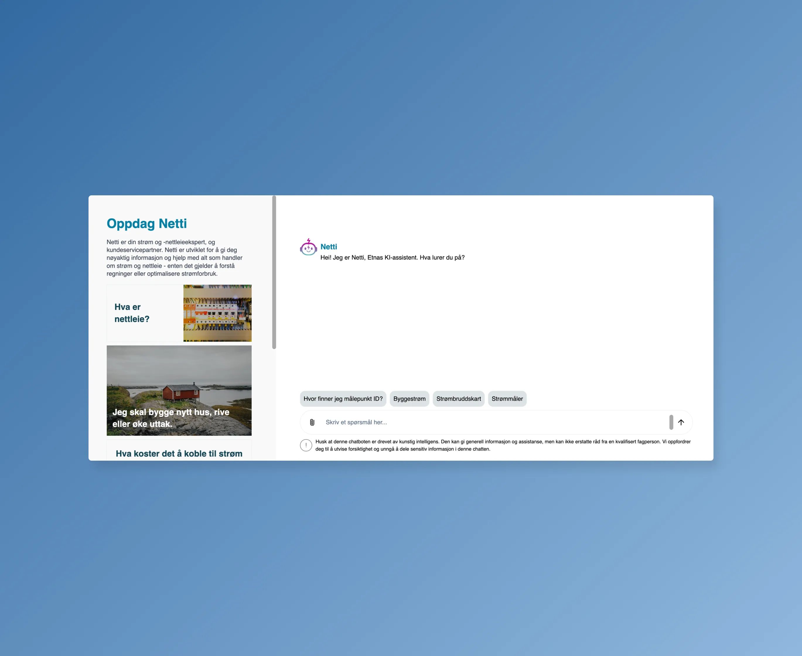 En KI-assistent som førstelinjesupport for nettleiekunder som effektivt håndterer vanlige henvendelser om strømbrudd, fakturaer og generelle spørsmål. KI-assistenten er tilpasset spesifikk bransjekunnskap og data fra nettselskaper i Norge. Den er trent på relevante dokumenter og informasjon knyttet til ulike nettleieselskaper, og kan dermed gi presise og relevante svar til kunder på forskjellige lokasjoner. Denne løsningen øker tilgjengeligheten, reduserer ventetiden og gir kundene mulighet til å få hjelp uten å måtte kontakte kundeservice direkte, samtidig som den opprettholder kostnadseffektiv drift.