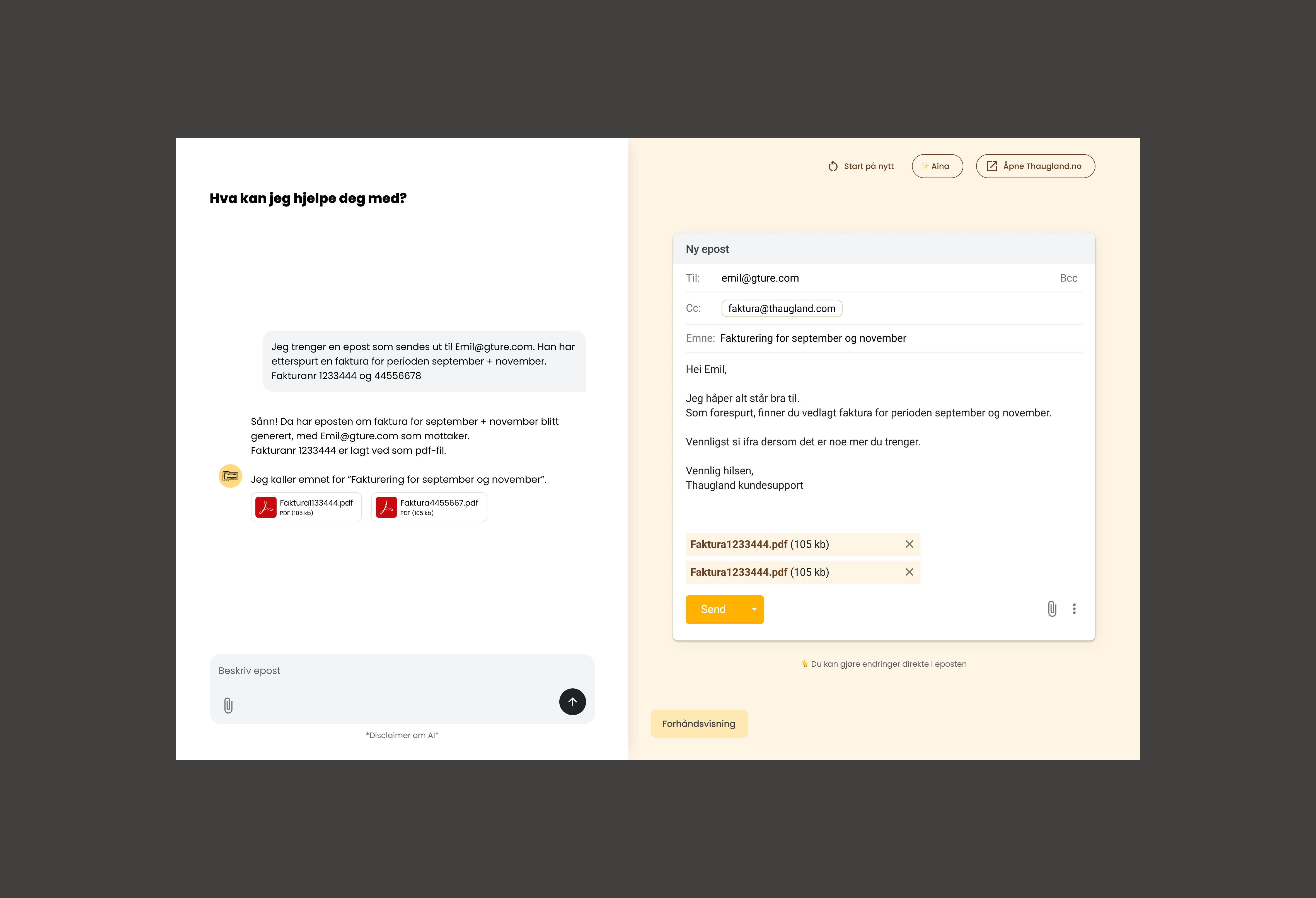 En KI-drevet plattform med et felles brukergrensesnitt som effektiviserer informasjons- og filhåndtering, samt kommunikasjonen med kundene. Brukeren kan enkelt samhandle med en KI-agent som fungerer som en digital kollega, utfører oppgaver, forenkler arbeidsflyten og øker produktiviteten. Agenten henter filer fra ulike mapper, trekker ut relevant informasjon fra databaser og genererer e-postutkast med vedlegg, slik at brukeren raskt kan sende den nødvendige informasjonen til riktig mottaker.
